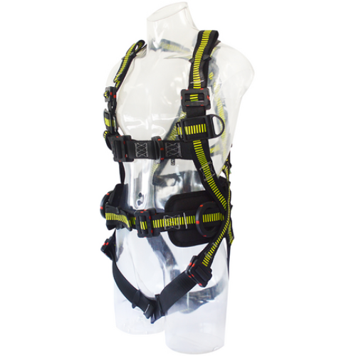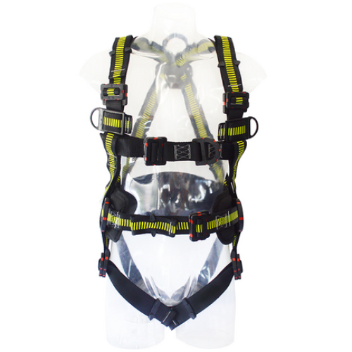 Composición del soporte principal : ABS – Acero – poliéster | Hebilla manual | Punto de anclaje anticaídas : 2 – Dorsal – Frontal | Puntos de conexión de sujeción y posicionamiento : 2 – laterales | Compatibilidad : Compatible con elemento de amarre anticaídas (eslingas) requerimiento ANSI | Número de puntos de conexión anticaídas : 2